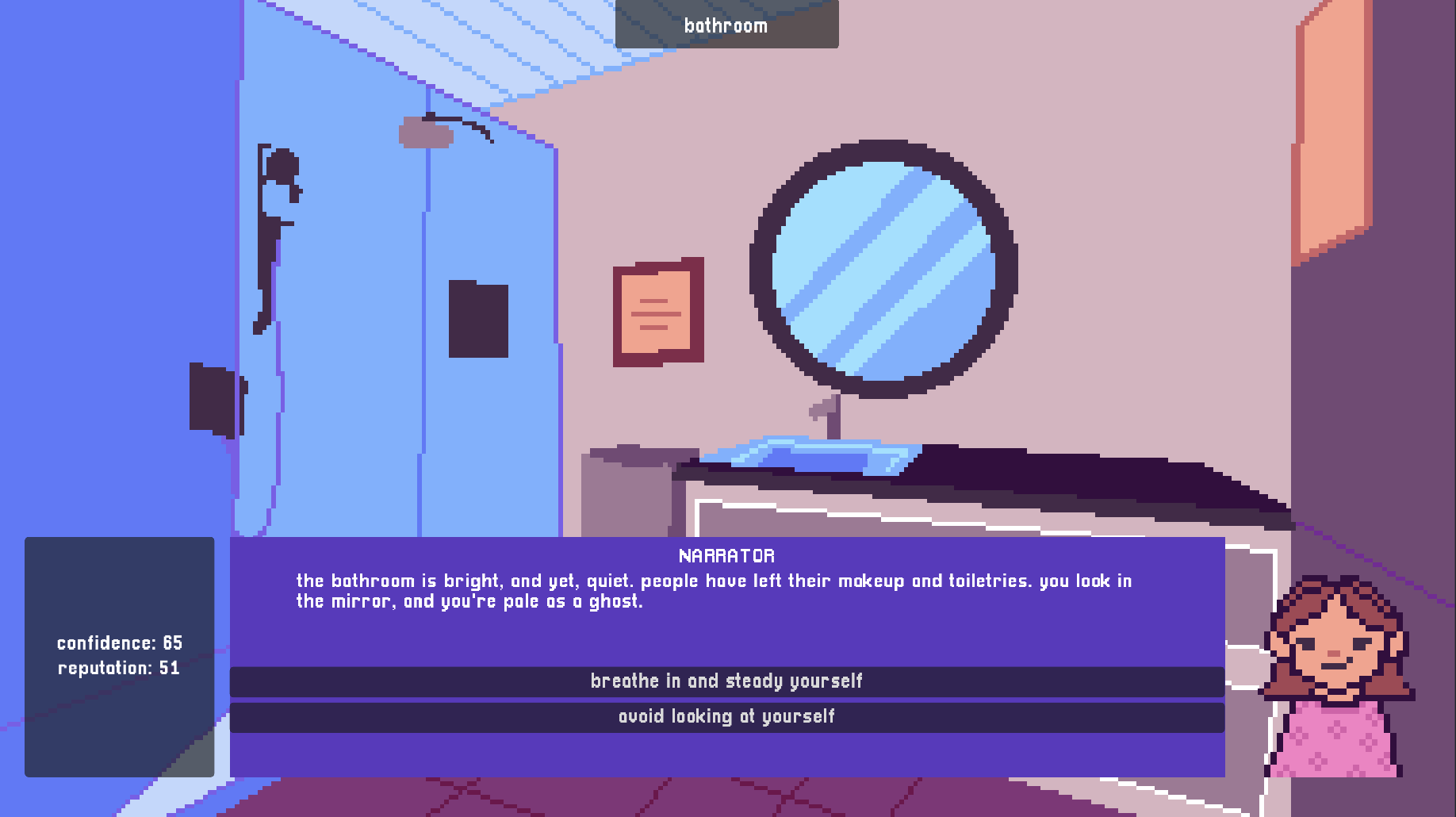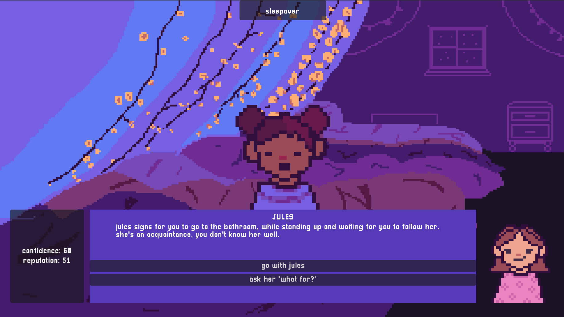 this is a story game in which you act as noelle, a highschooler at a sleepover, who gets involved in a rumor and some serious acussations about... smelly feet!